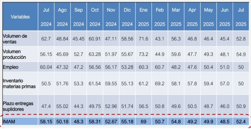 El Índice Mensual de Actividad Manufacturera (IMAM) volvió a escalar sobre el umbral de 50, al colocarse en 52.4 en julio, luego de tres meses consecutivos bajo esta barrera.
