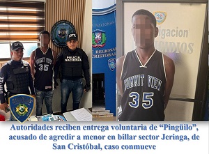 Este martes fue entregado de manera voluntaria a miembros de la Sub Dirección Regional de Investigaciones y del departamento de DINTEL, así como a oficiales de la Dirección Regional San Cristóbal de la Policía Nacional, el nombrado Luis Manuel Jiménez (a) “Pingüilo”, residente en el sector Las Flores, provincia San Cristóbal, identificado como el hombre captado en un video difundido en redes sociales mientras golpeaba a un menor de 12 años dentro de un billar, hecho que causó gran repudio en la opinión pública.