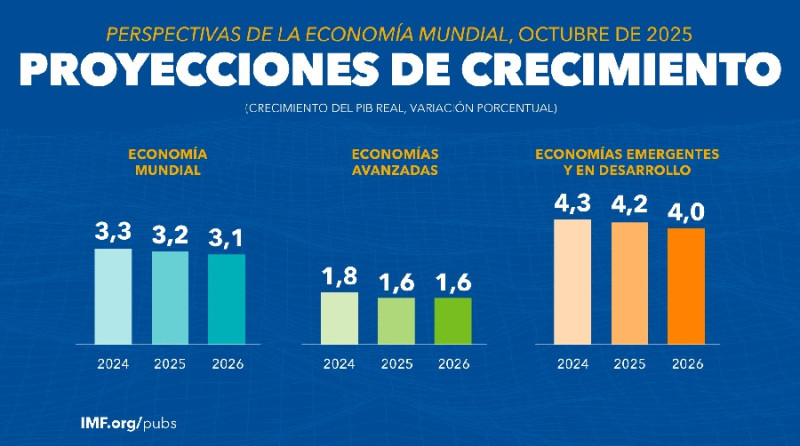 En su informe de actualización del informe sobre Perspectivas de la Economía Mundial 2025, presentado este martes como parte de las Reuniones Anuales (Otoño), del FMI y el Banco Mundial, en Washington, Estados Unidos, el organismo financiero multilateral proyecta que la economía global se desacelerará del 3.3% del 2024 a 3.2% en 2025 y a 3.1% en 2026.