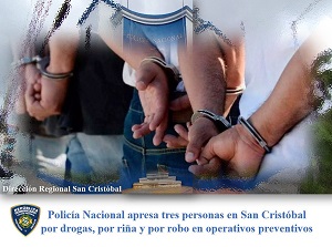 En el marco de los operativos preventivos desplegados por la Dirección Regional San Cristóbal de la Policía Nacional, fueron apresadas tres personas en distintos hechos delictivos ocurridos en varios sectores de esta demarcación.