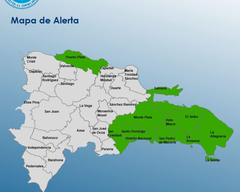 En ese sentido, las provincias que se encuentran en alerta verde son La Altagracia, San Pedro de Macorís, Samaná, La Romana, Hato Mayor, Monte Plata, El Seibo, Distrito Nacional, Puerto Plata, Santo Domingo y San Cristóbal.