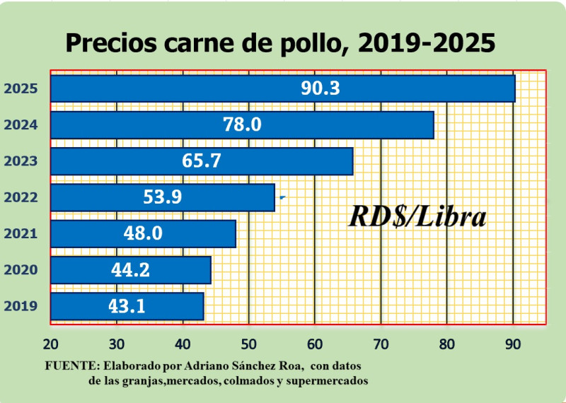 El exsenador y agrónomo Adriano Sánchez Roa denunció este domingo que la escasez y el aumento del precio de la carne de pollo en el país, que supera los RD$100.00 por libra en numerosas localidades, son el resultado directo de la falta de planificación gubernamental frente a los efectos del denso calor sobre la producción avícola nacional.